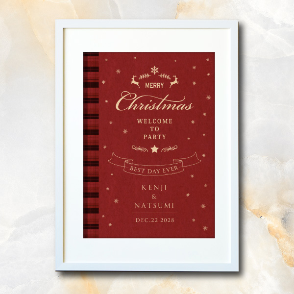 さりげないタータン・チェックがおしゃれで大人感をアップ。赤を基調とした温かみあるクリスマスウェディングを演出してくれます。「メリークリスマス」のメッセージと共にゲストを華やかにお出迎えしましょう。
