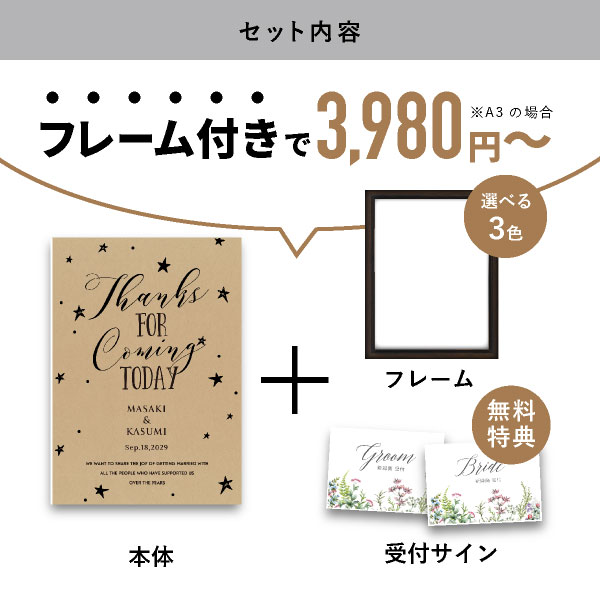 | 無料特典 | 受付サイン1組(新郎用×1組、新婦用×1組) |