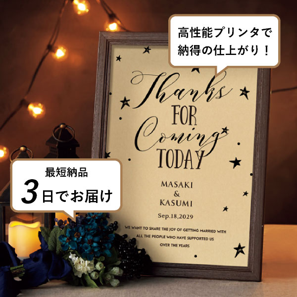 散りばめられたスターはナイトウェディングに相性抜群です。クラフト&スターでカジュアルなナチュラルウェディングを演出してくれます。「Thanks」の文字が印象的なウェルカムボードで、ゲストに感謝の気持ちを伝えましょう。