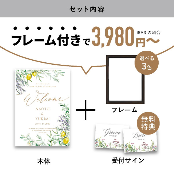 | 無料特典 | 受付サイン1組(新郎用×1組、新婦用×1組) |