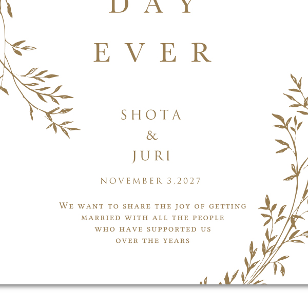 草花をモチーフにした模様のデザインで、上品さの中にもナチュラルな印象をプラス。フランス語で「幸運」の名前をもつ華やかなアイテムで、おふたりの幸せな結婚式が叶いますように。