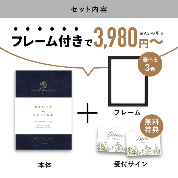 | 内容物 | グラフィック ウェルカムボード ■フレーム付き(A3サイズは3種類よりお選びいただけます。A2サイズは2種類よりお選びいただけます。) |