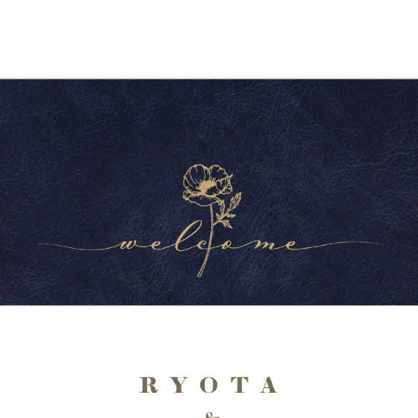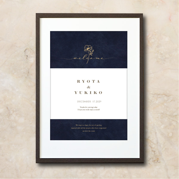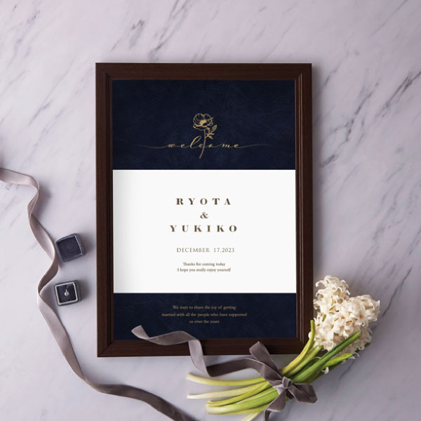 本物の革のような重厚感があるネイビーの背景に、自然をモチーフにした洗練された模様を施した格調高い雰囲気を演出してくれます。ホテルウェディングやクラシカルスタイルのウェディングにおすすめです。
