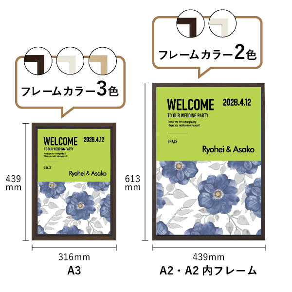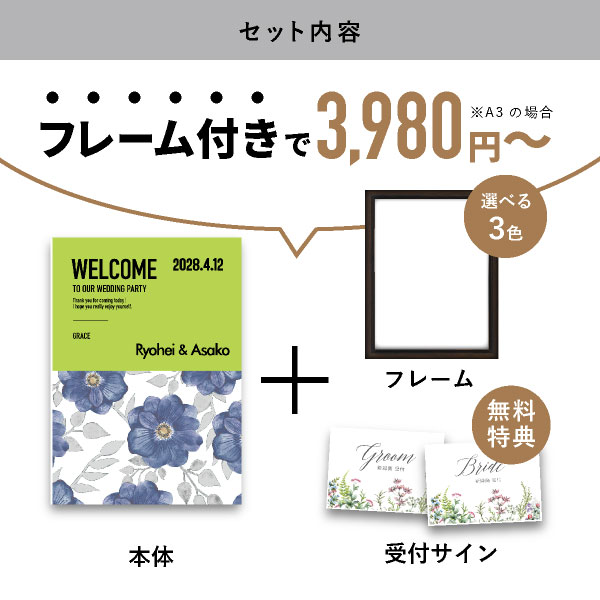 | 内容物 | グラフィック ウェルカムボード ■フレーム付き(A3サイズは3種類よりお選びいただけます。A2サイズは2種類よりお選びいただけます。) |