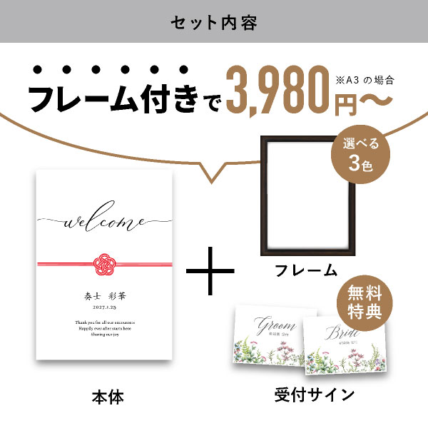 | 内容物 | グラフィック ウェルカムボード ■フレーム付き(A3サイズは3種類よりお選びいただけます。A2サイズは2種類よりお選びいただけます。) |