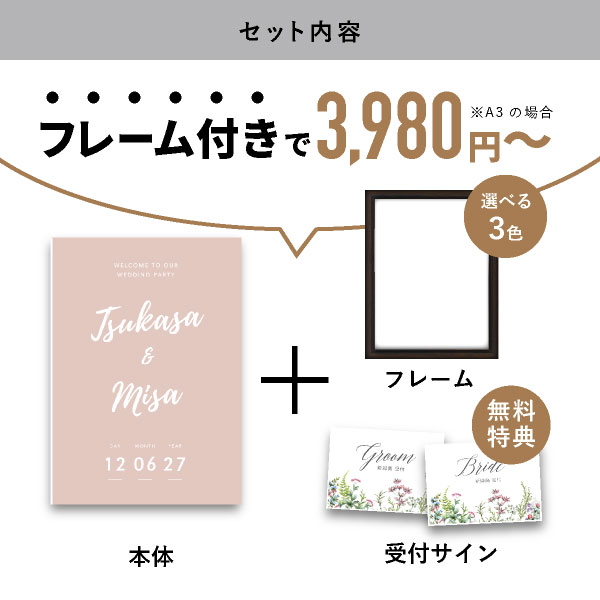 | 無料特典 | 受付サイン1組(新郎用×1組、新婦用×1組) |