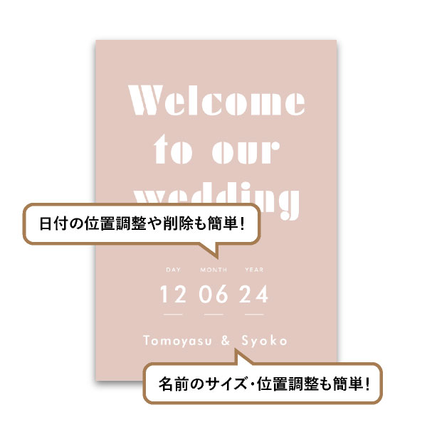 落ち着いたくすみカラーとポップな文字がウェルカムスペースをおしゃれに演出、ふたりの晴れの日を可愛いく演出します。