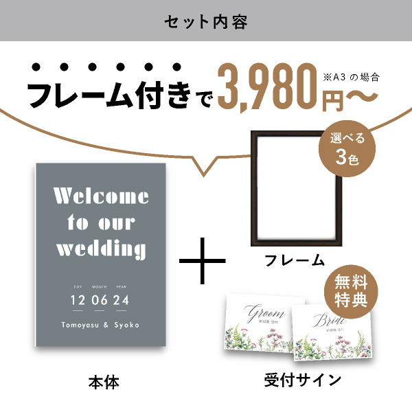 | 無料特典 | 受付サイン1組(新郎用×1組、新婦用×1組) |
