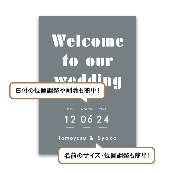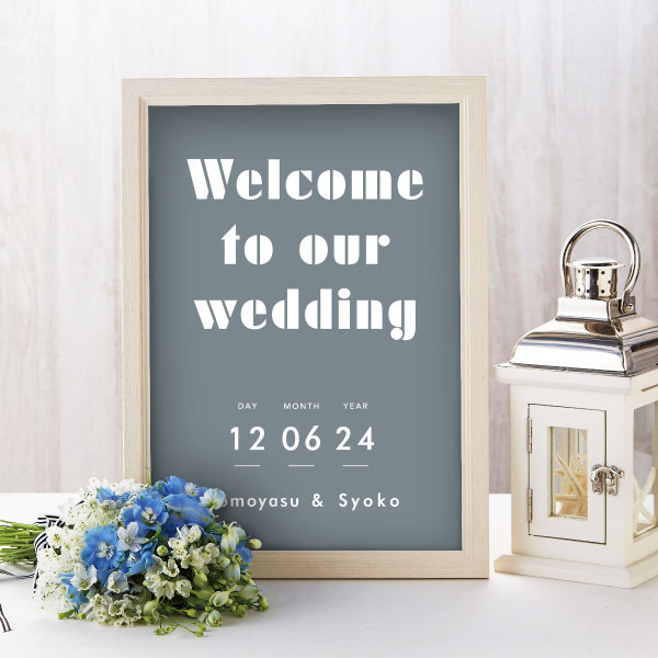 落ち着いたくすみカラーとポップな文字がウェルカムスペースをおしゃれに演出、ふたりの晴れの日を可愛いく演出します。