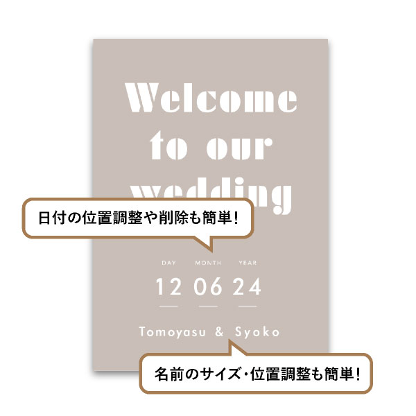 落ち着いたくすみカラーとポップな文字がウェルカムスペースをおしゃれに演出、ふたりの晴れの日を可愛いく演出します。