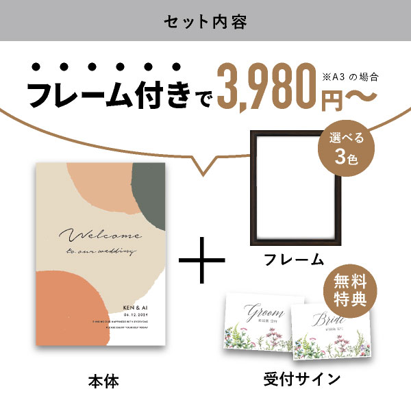| 内容物 | グラフィック ウェルカムボード ■フレーム付き(A3サイズは3種類よりお選びいただけます。A2サイズは2種類よりお選びいただけます。) |