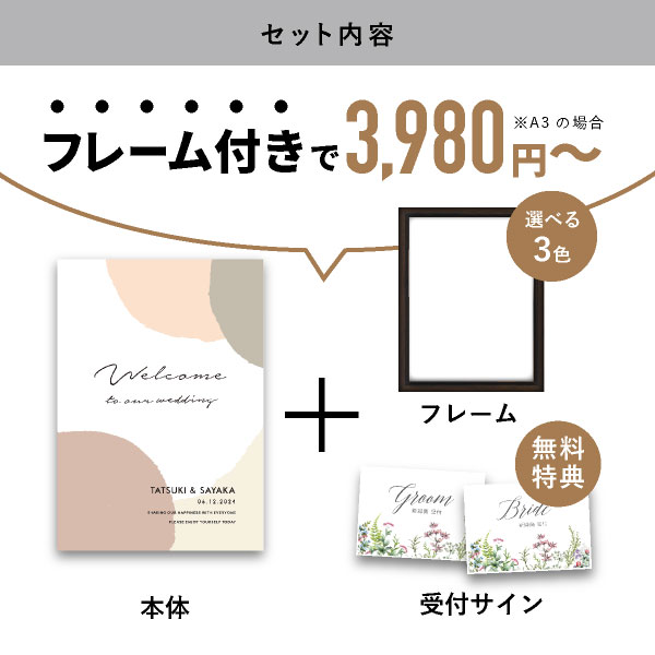 | 内容物 | グラフィック ウェルカムボード ■フレーム付き(A3サイズは3種類よりお選びいただけます。A2サイズは2種類よりお選びいただけます。) |