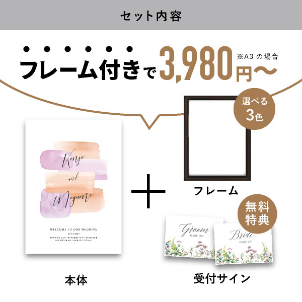 | 無料特典 | 受付サイン1組(新郎用×1組、新婦用×1組) |