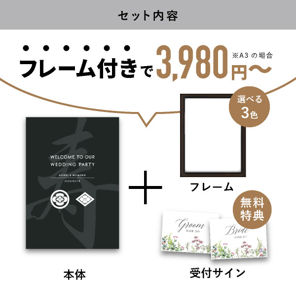 | 無料特典 | 受付サイン1組(新郎用×1組、新婦用×1組) |