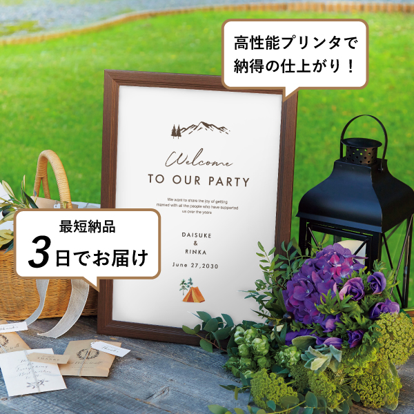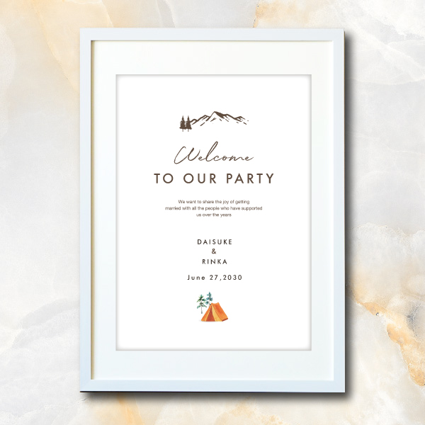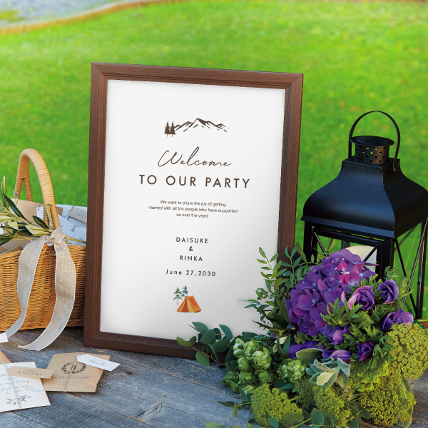 キャンプやピクニックなどアウトドア好きのおふたりにぴったりのウェルカムボード。