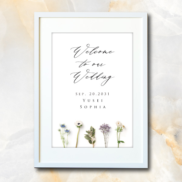 複数の花が組み合わせられ、クールで上品さが溢れるウェルカムボードです。