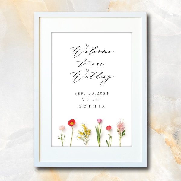 複数の花が組み合わせられ、色鮮やかで可愛らしさ溢れるウェルカムボードです。