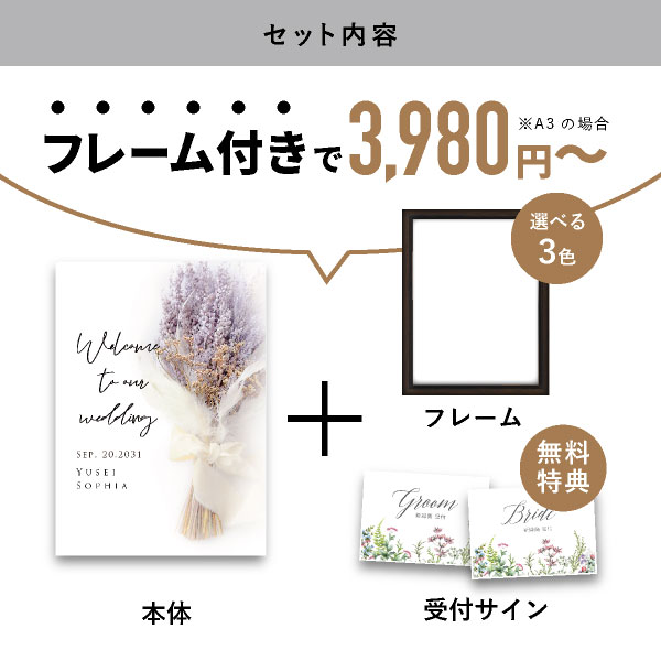 | 内容物 | グラフィック ウェルカムボード ■フレーム付き(A3サイズは3種類よりお選びいただけます。A2サイズは2種類よりお選びいただけます。) |