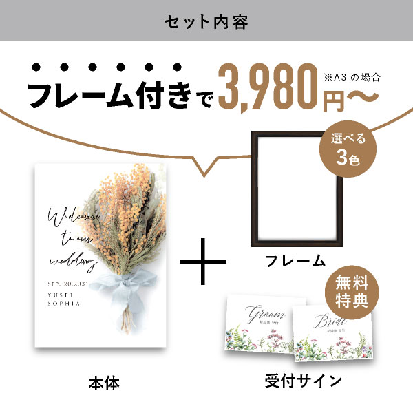 | 内容物 | グラフィック ウェルカムボード ■フレーム付き(A3サイズは3種類よりお選びいただけます。A2サイズは2種類よりお選びいただけます。) |