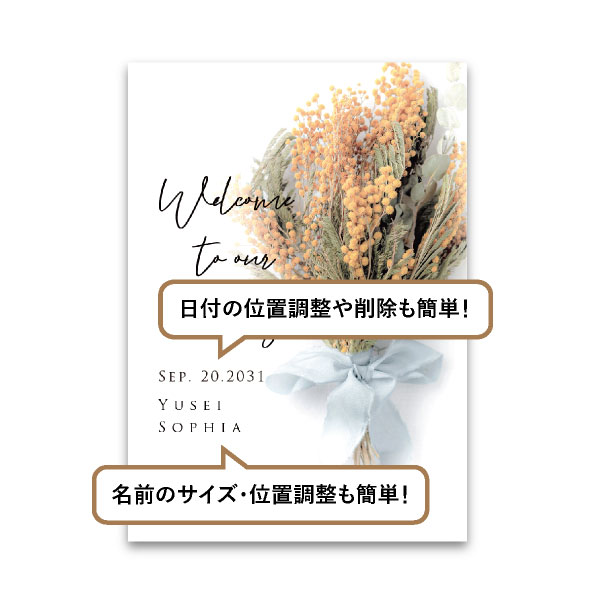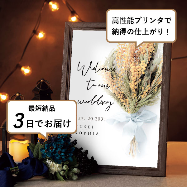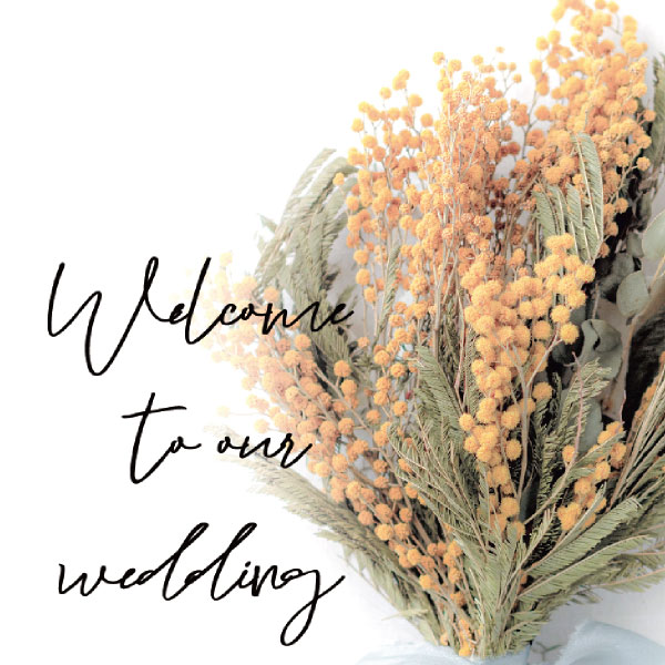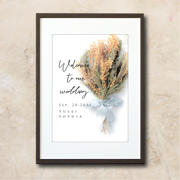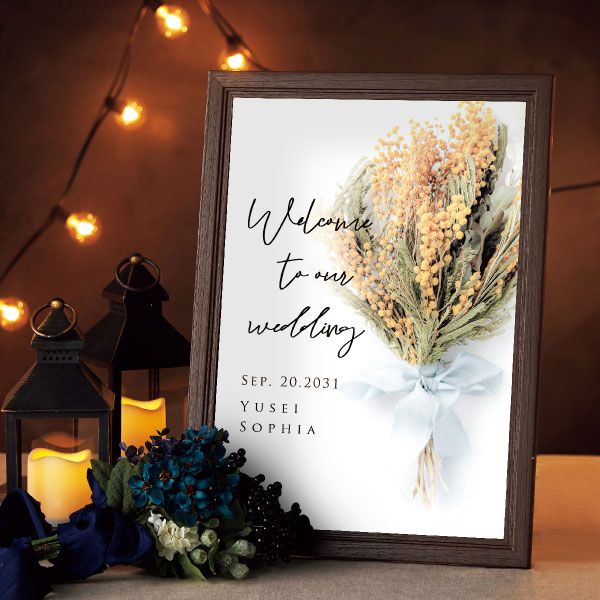 結婚式にふさわしい、純白の背景に落ち着いた大人っぽさを感じさせるミモザの花を使用したドライブーケが印象的なウェルカムボード。カジュアルウェディングやラステッィックウェディングにぴったりのデザインです。