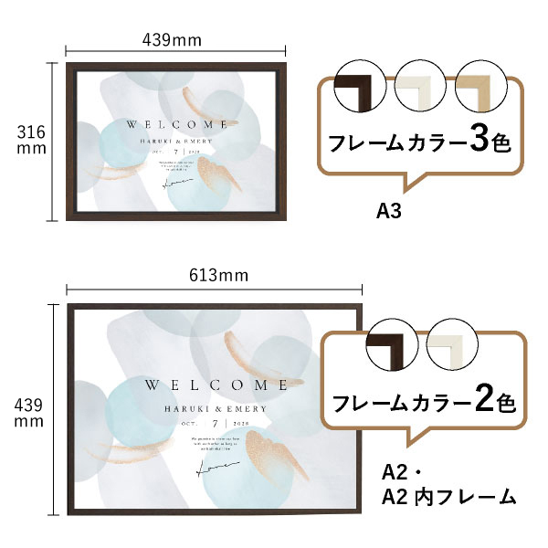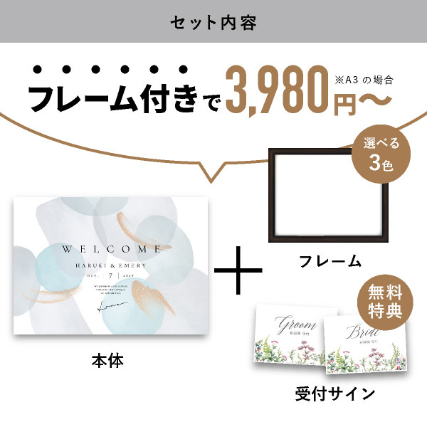 | 内容物 | グラフィック ウェルカムボード ■フレーム付き(A3サイズは3種類よりお選びいただけます。A2サイズは2種類よりお選びいただけます。) |