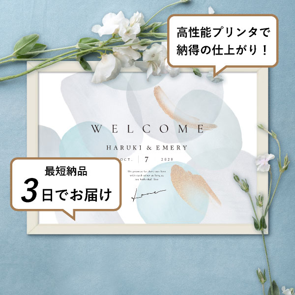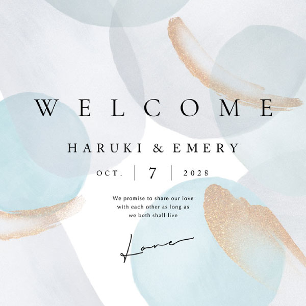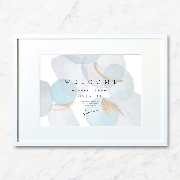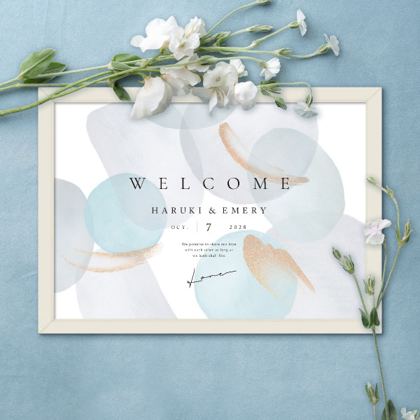 透明感を感じる淡い色合いのウォーターカラーに光沢を感じるグリッター風のゴールドパールデザインが可愛いウェルカムボード。洗練されたおしゃれでかっこいいスタイルからナチュラルテイストにマッチする大人おしゃれアイテム!おしゃれなインテリアとしても置けるので、いつまでも思い出として飾れます。