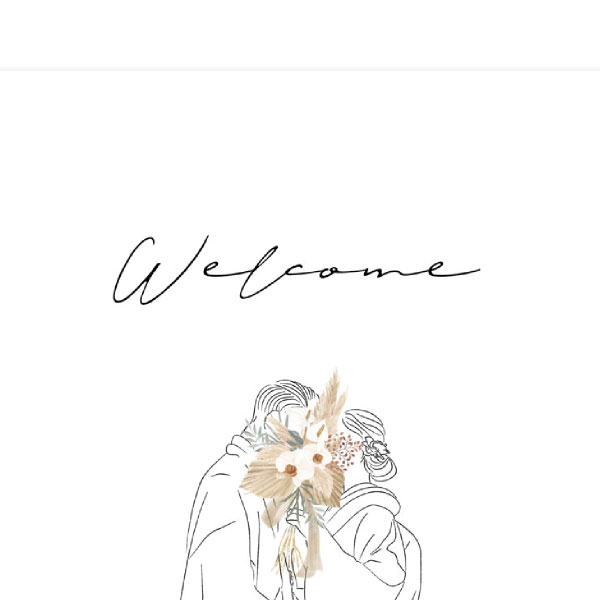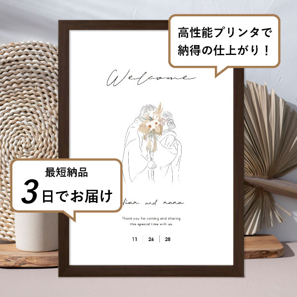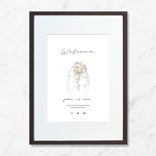 和装の新郎新婦がブーケで顔を隠している、可愛らしいシチュエーションをカジュアルでスタイリッシュに描いたおしゃれなアイテム。日本伝統の和装でありながらシンプルなデザインが和洋どちらのテイストでもおしゃれにウェルカムスペースを演出します!挙式後はお部屋のインテリアとしてピッタリです!いつまでも大切な想い出として飾れます。