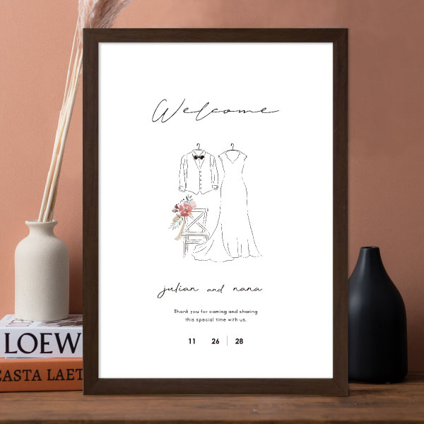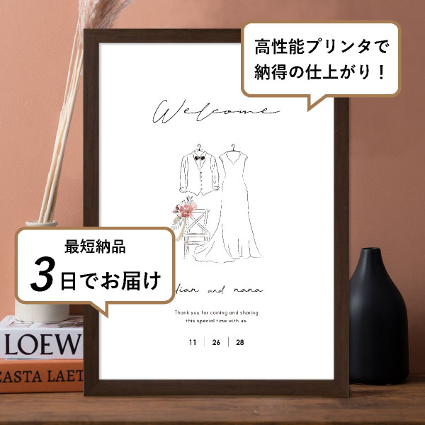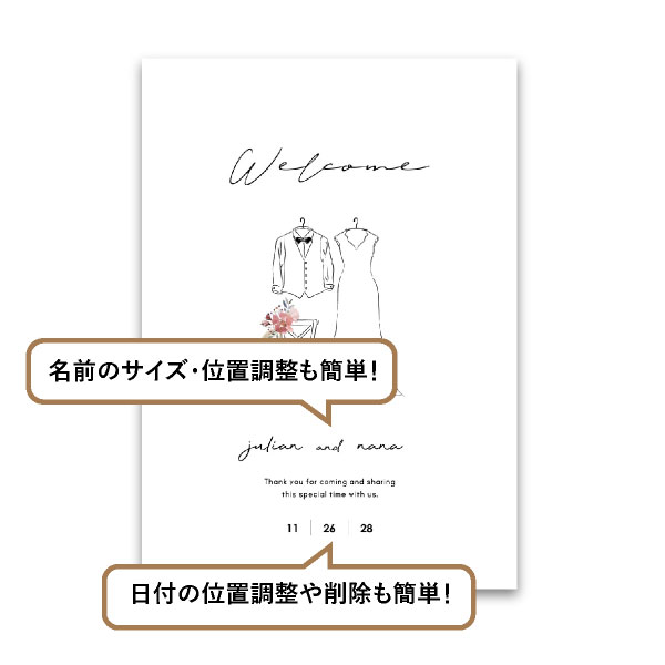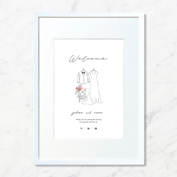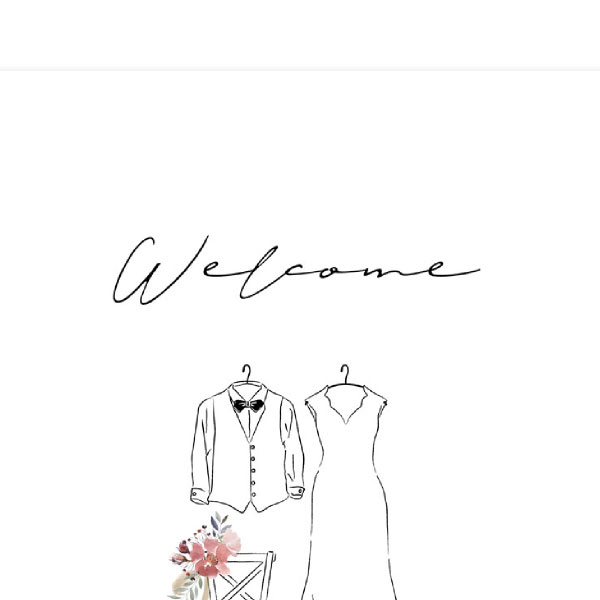 ナチュラルウェディング・ガーデンウェディングなどにピッタリ!シンプルなデザインのウェルカムボードです。タキシードとドレスが壁に掛けられているイラストは、これからどんな姿のおふたりを見れるのか友人や親族の想像力を掻き立てワクワク感を与えてくれます!
