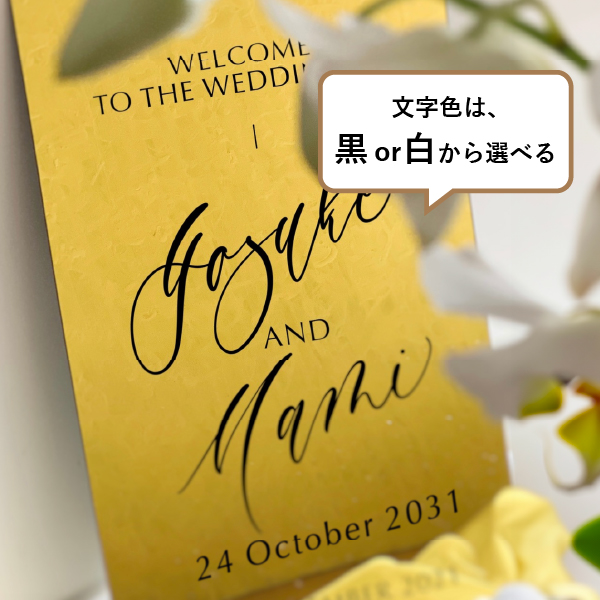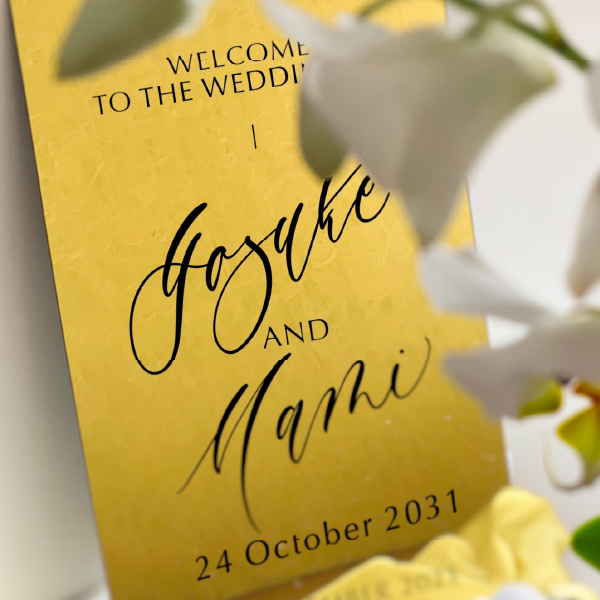 トレンドに敏感な花嫁に人気な、ライトゴールドのアクリルミラーウェルカムボード。