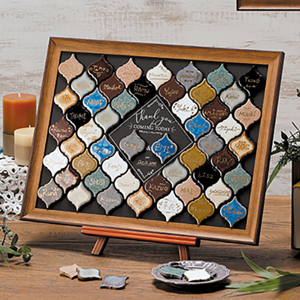 ゲストがおふたりの幸せを想いながらタイルに名前を書き、ひとつのウェルカムボードにそれぞれお好きな場所に貼って作るオリジナルボード。