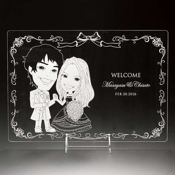 クリアな輝きのアクリルボードに似顔絵をレーザー加工した、ゲストの目を惹くウェルカムボード。