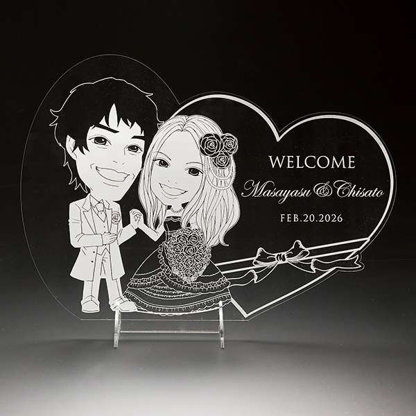 クリアな輝きのアクリルボードに似顔絵をレーザー加工した、ゲストさまの目を惹くウェルカムボード。
