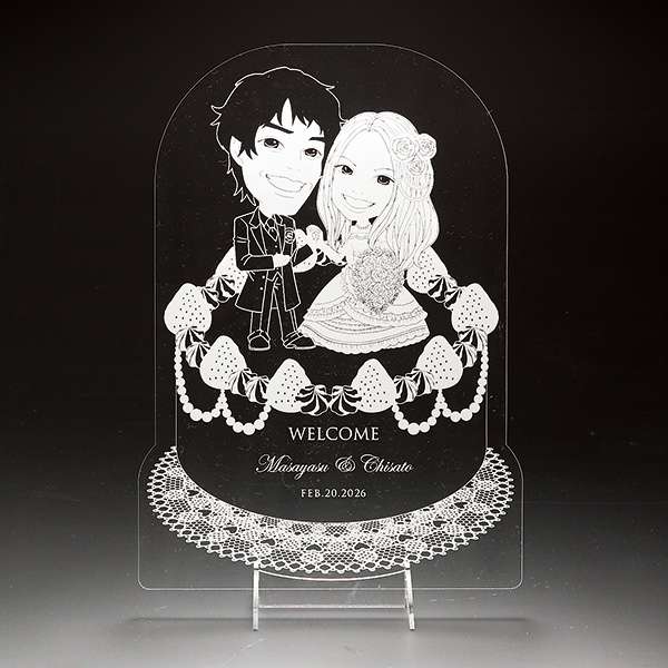 クリアな輝きのアクリルボードに似顔絵をレーザー加工した、ゲストさまの目を惹くウェルカムボード。