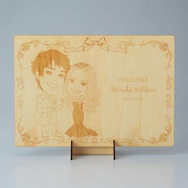 丁寧に彫刻されたおふたりの似顔絵と大切な記念日。今日という日が素晴らしいものになりますよう。