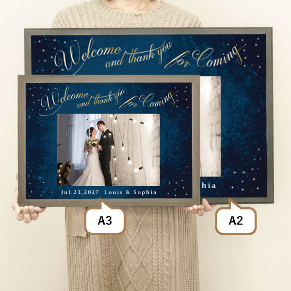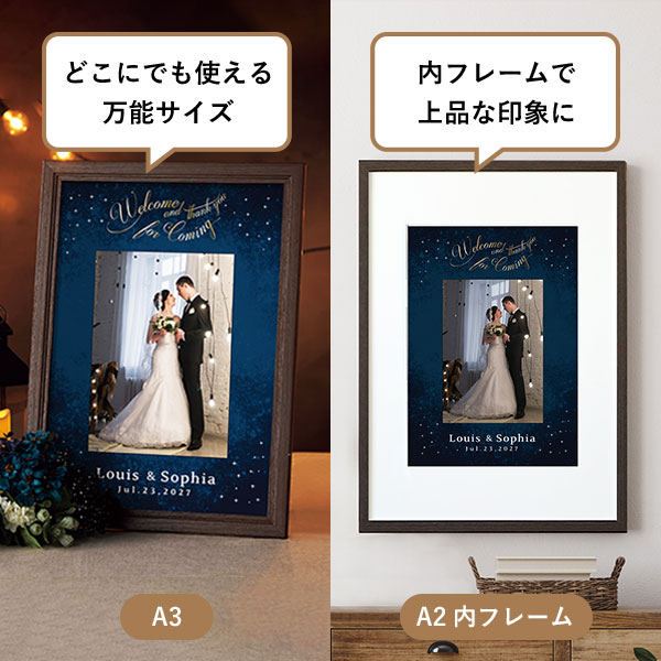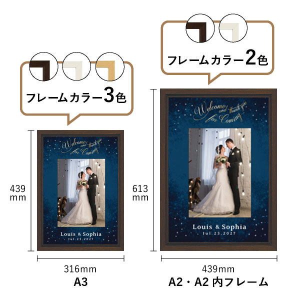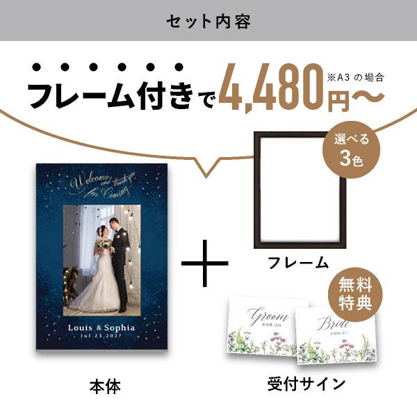 | 内容物 | ウェルカムボード×1 ■フレーム付き(A3サイズは3種類よりお選びいただけます。A2サイズは2種類よりお選びいただけます。) |