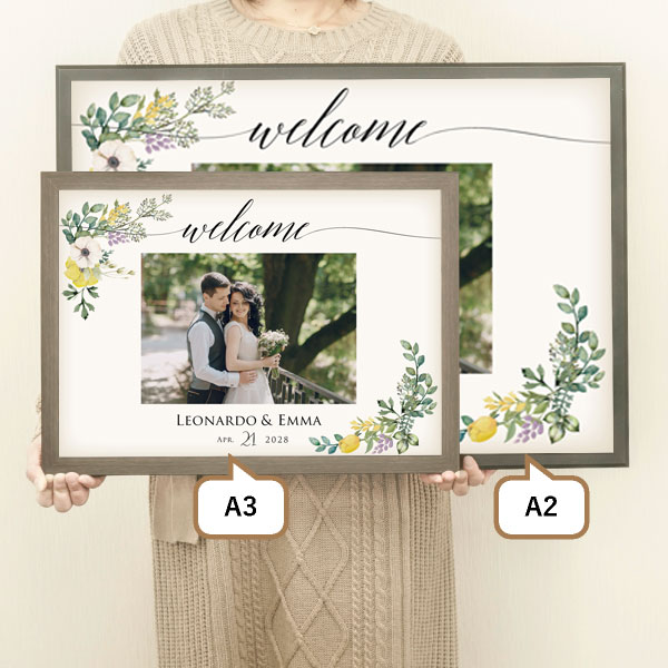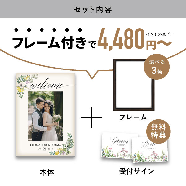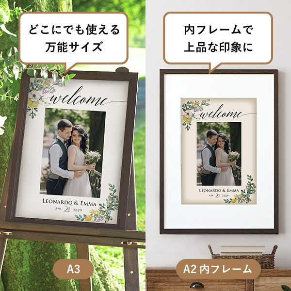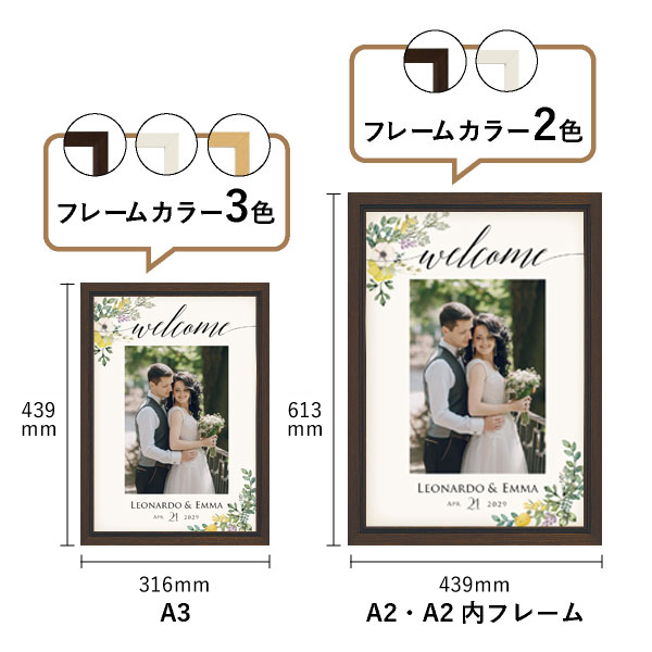 | 内容物 | ウェルカムボード×1 ■フレーム付き(A3サイズは3種類よりお選びいただけます。A2サイズは2種類よりお選びいただけます。) |