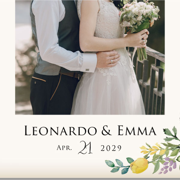 ナチュラルに描かれた草花が、爽やかに漂うリラックスウェディングを演出。やわらかな色調で、心地よく、迎えられたゲスト様も、自然と笑顔がこぼれます。イエローフラワーがアクセントになり、エレガントさもプラスされ、大人可愛いデザインになっています。