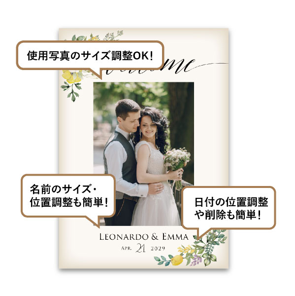 デザインがかわいいのとお値段がリーズナブルだったので購入を決めました。 発注の際、写真のサイズが大きかったため、自身でサイズを変更したので、どんな画質になるのか不安でしたが、届いて確認したところ、とても綺麗に出来上がっていてよかったです。 和装の前撮り写真を使用したので、デザインと合うか気にしていましたが、それも問題なく大変満足しています。 ありがとうございました!
