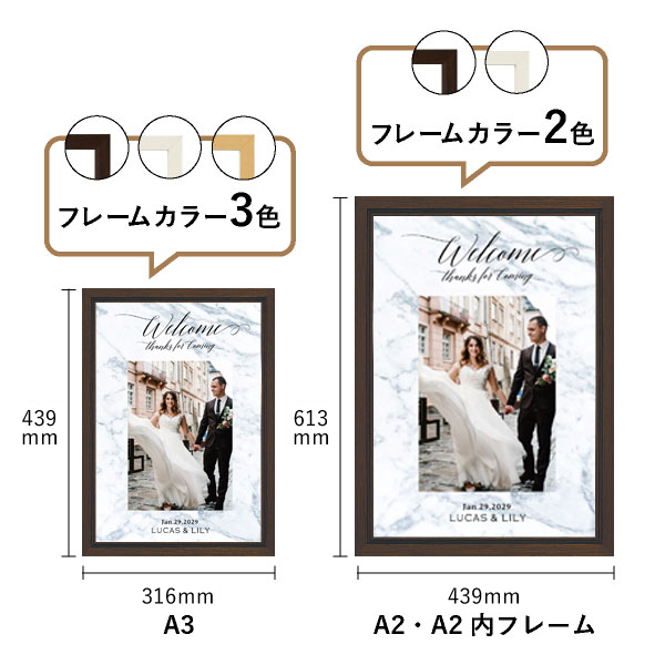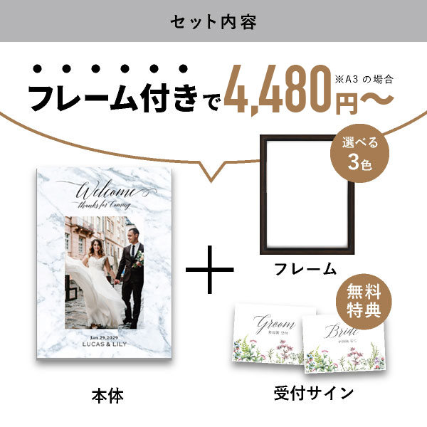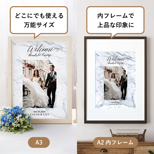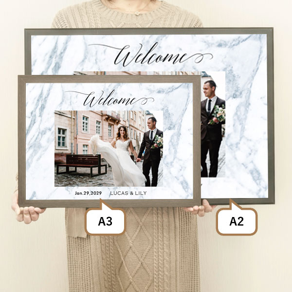| 内容物 | ウェルカムボード×1 ■フレーム付き(A3サイズは3種類よりお選びいただけます。A2サイズは2種類よりお選びいただけます。) |