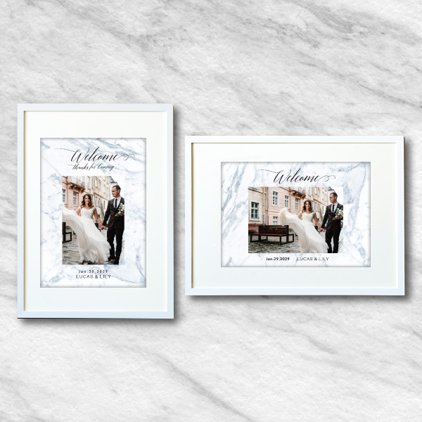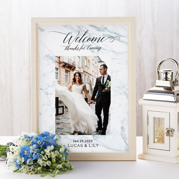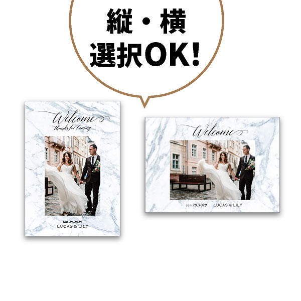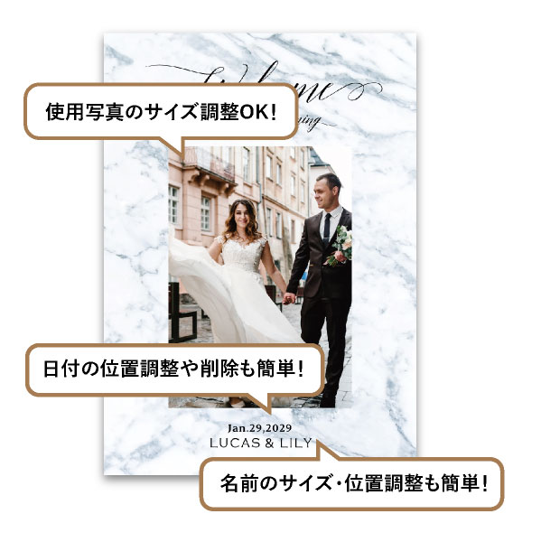 高級感溢れる、大理石模様が大胆にデザインされており、シックで大人な雰囲気がかっこいいデザインです。淡いお色ですので、中央に入るおふたりの写真がよく映えます。シンプルなデザインですので、挙式後は、ご自宅で飾っていただいても素敵です。