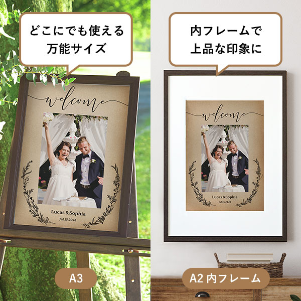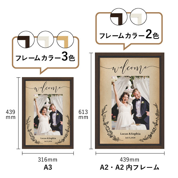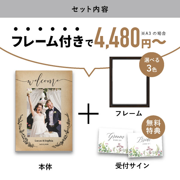 | 内容物 | ウェルカムボード×1 ■フレーム付き(A3サイズは3種類よりお選びいただけます。A2サイズは2種類よりお選びいただけます。) |