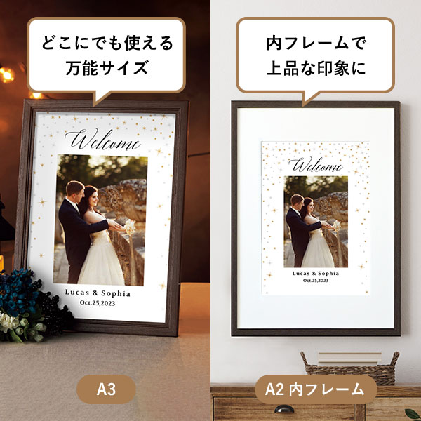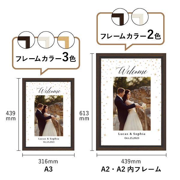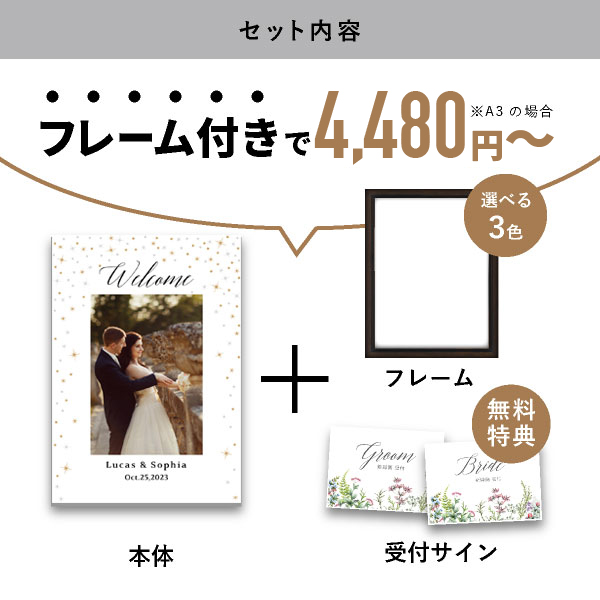 | 内容物 | ウェルカムボード×1 ■フレーム付き(A3サイズは3種類よりお選びいただけます。A2サイズは2種類よりお選びいただけます。)  |