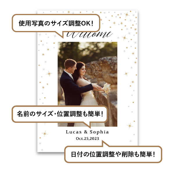 キラリと光るゴールドの輝き。高級感あふれるウェルカムボードは、散りばめられたゴールドをまるで夜空に煌く花火のようなデザインでおしゃれにお出迎え。シンプルとゴージャスが絶妙なバランス。ゴールドの輝きで、結婚式にふさわしい華やかさを上品に演出します。おふたりの大切な時間をより輝かしいものにといった気持ちが詰まった商品になります。