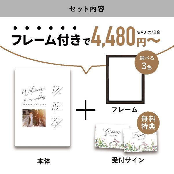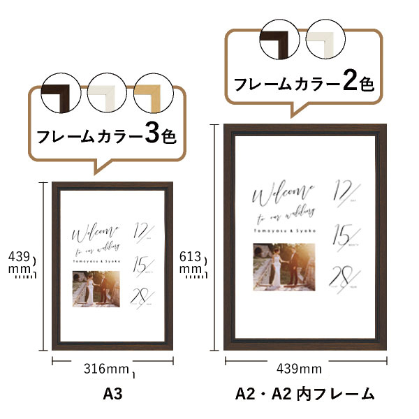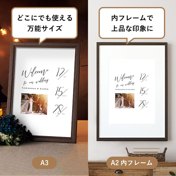 | 内容物 | フォトウェルカムボード ■フレーム付き(A3サイズは3種類よりお選びいただけます。A2サイズは2種類よりお選びいただけます。) |