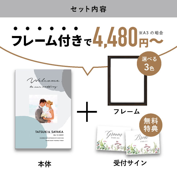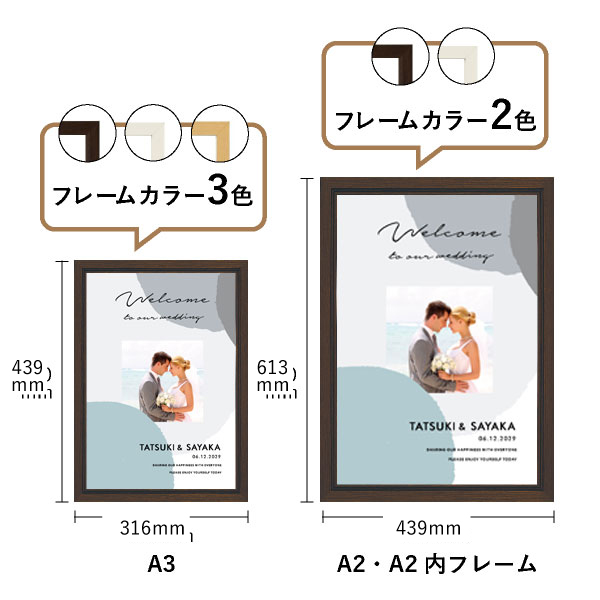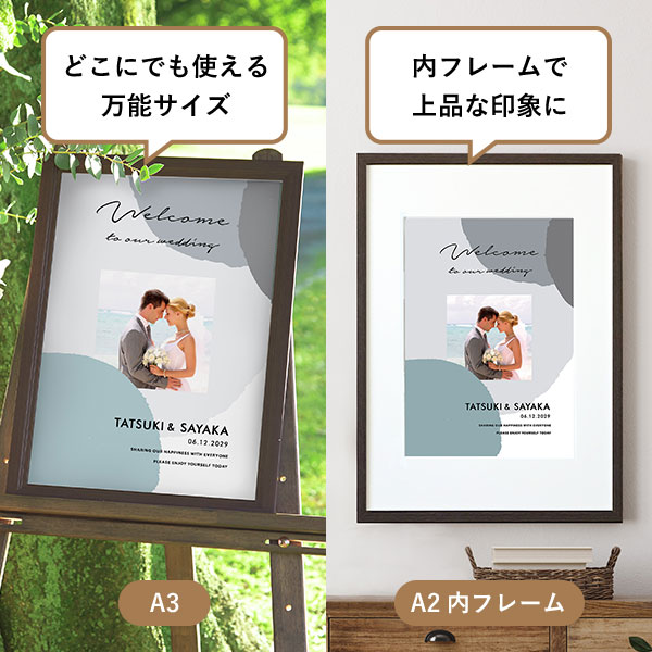 | 内容物 | フォトウェルカムボード ■フレーム付き(A3サイズは3種類よりお選びいただけます。A2サイズは2種類よりお選びいただけます。) |