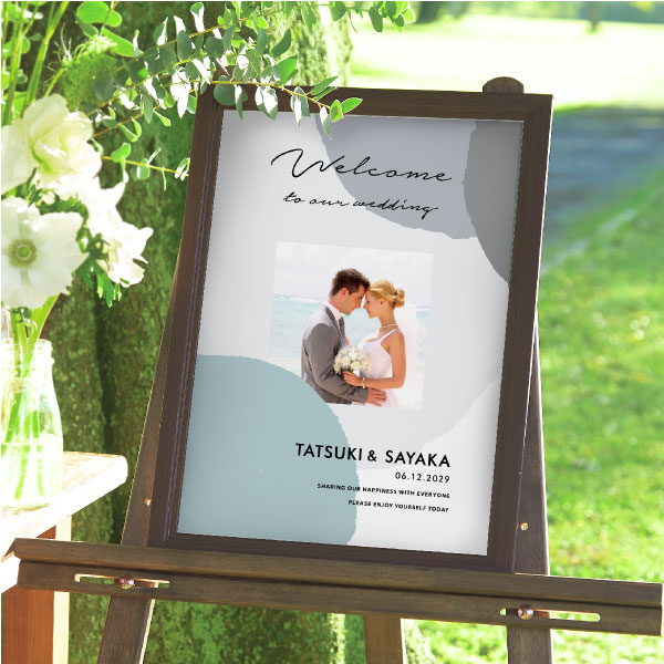 周囲の風景に溶け込むカモフラージュ柄を使用したデザインのウェルカムボード。おふたりのウェルカムスペースに馴染みやすいのでおすすめです。カラーのブルーは、幸せの象徴とされておりますのでおふたりの結婚式に取り入れてみてはいかがでしょうか。文字は英語表記でお洒落な空間を演出します。