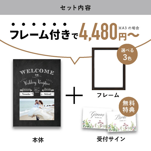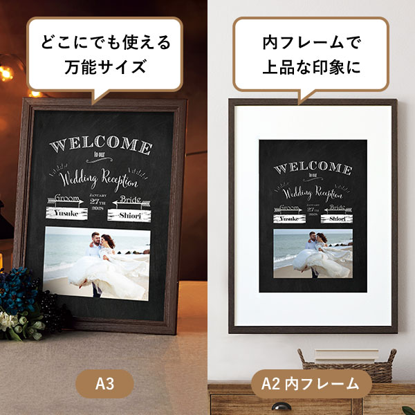 | 内容物 | フォトウェルカムボード ■フレーム付き(A3サイズは3種類よりお選びいただけます。A2サイズは2種類よりお選びいただけます。) |