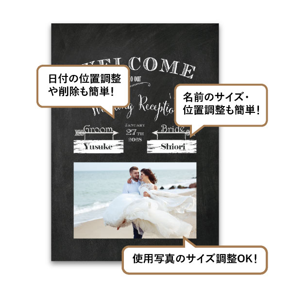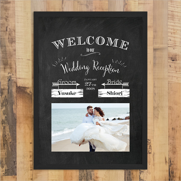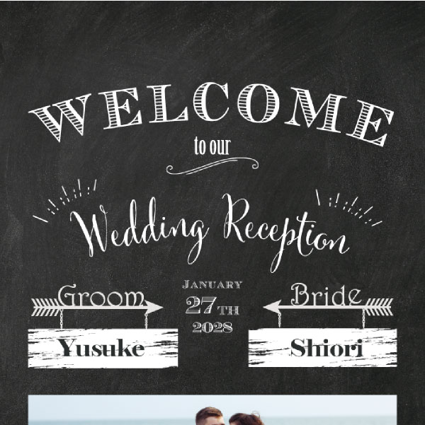 黒板風アートでお洒落な空間を作り出します。海外のカフェの立て看板のように、手描きの味わいを感じさせるチョークのかすれ感など黒板の風合いを表現したこだわりのデザイン。スタイリッシュなデザインの中央にはおふたりのお気に入りのお写真を入れてよりカジュアル感を演出します。