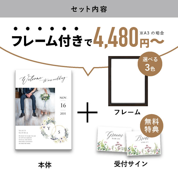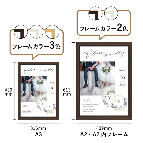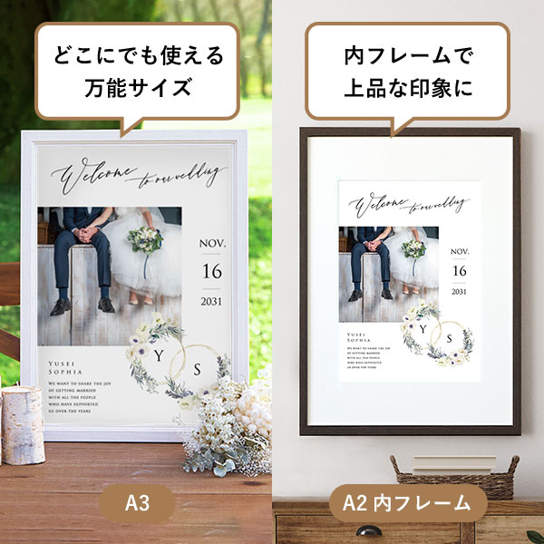 | 内容物 | フォトウェルカムボード ■フレーム付き(A3サイズは3種類よりお選びいただけます。A2サイズは2種類よりお選びいただけます。) |