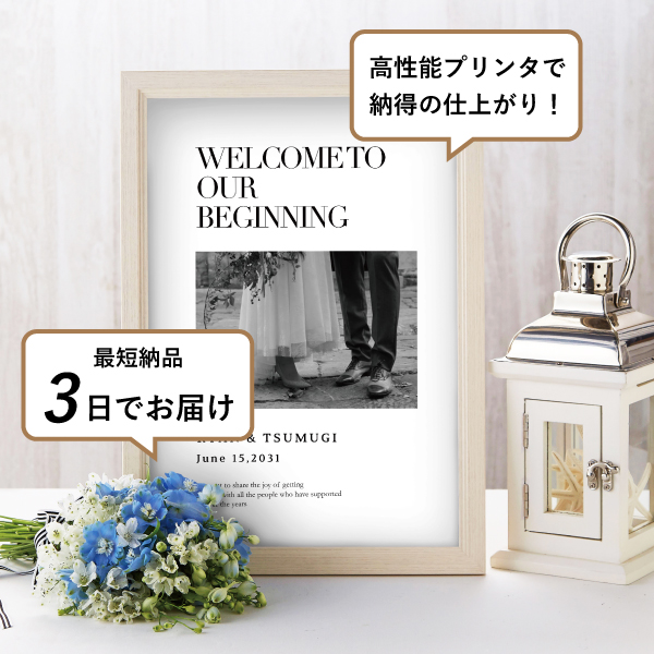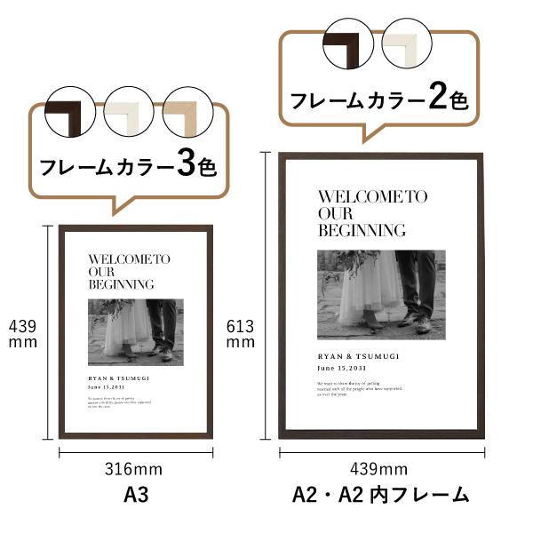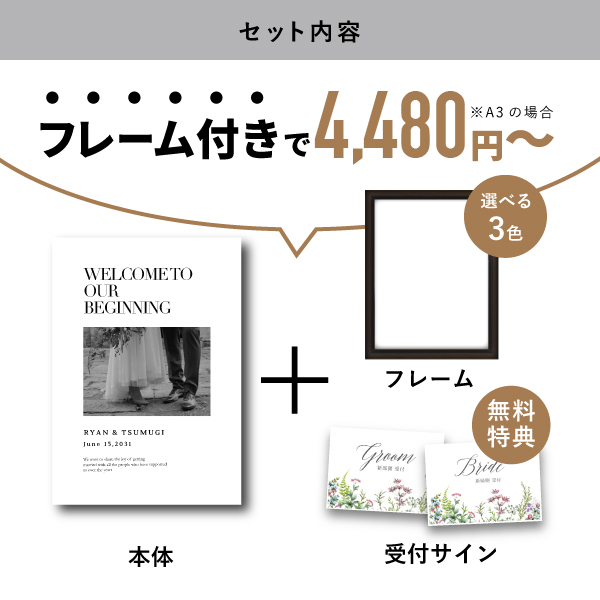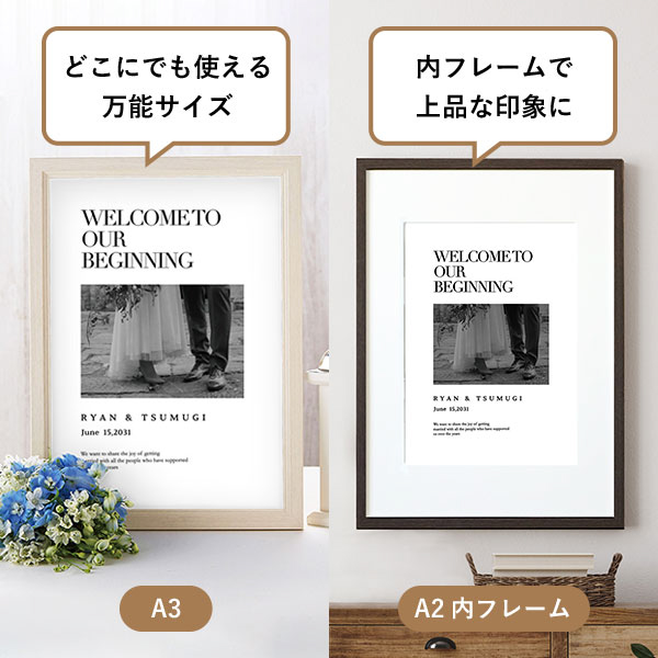 | 内容物 | フォトウェルカムボード ■フレーム付き(A3サイズは3種類よりお選びいただけます。A2サイズは2種類よりお選びいただけます。) |